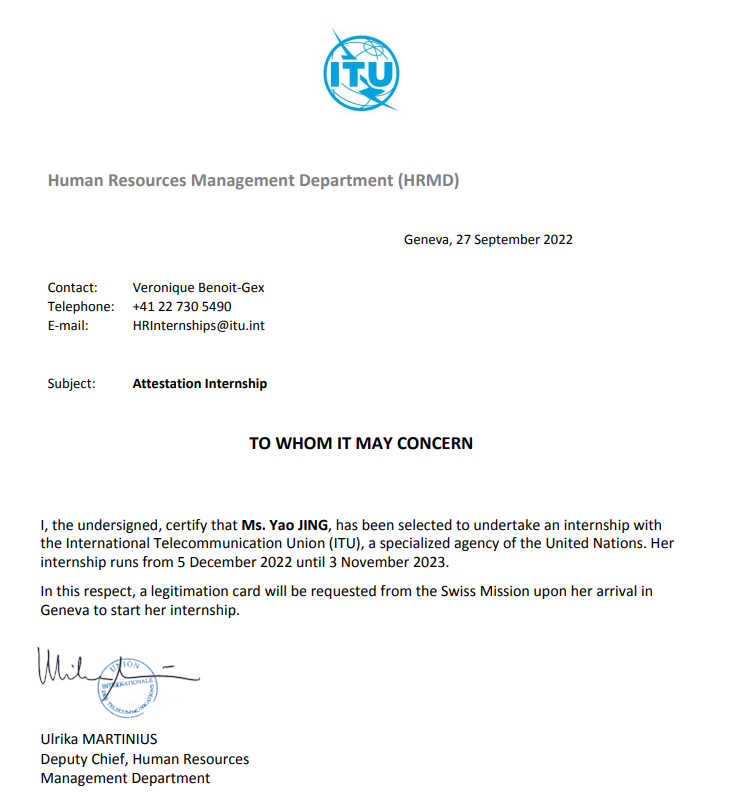 博士生景瑶同学脱颖而出,成功斩获国际电信联盟(联合国机构)实习offer,并将于2022年12月5日启程,赴瑞士日内瓦国际电信联盟电信标准化司进行为期近1年的实习,主要负责智能交通系统和道路安全人工智能方面的工作。这是日本av无码