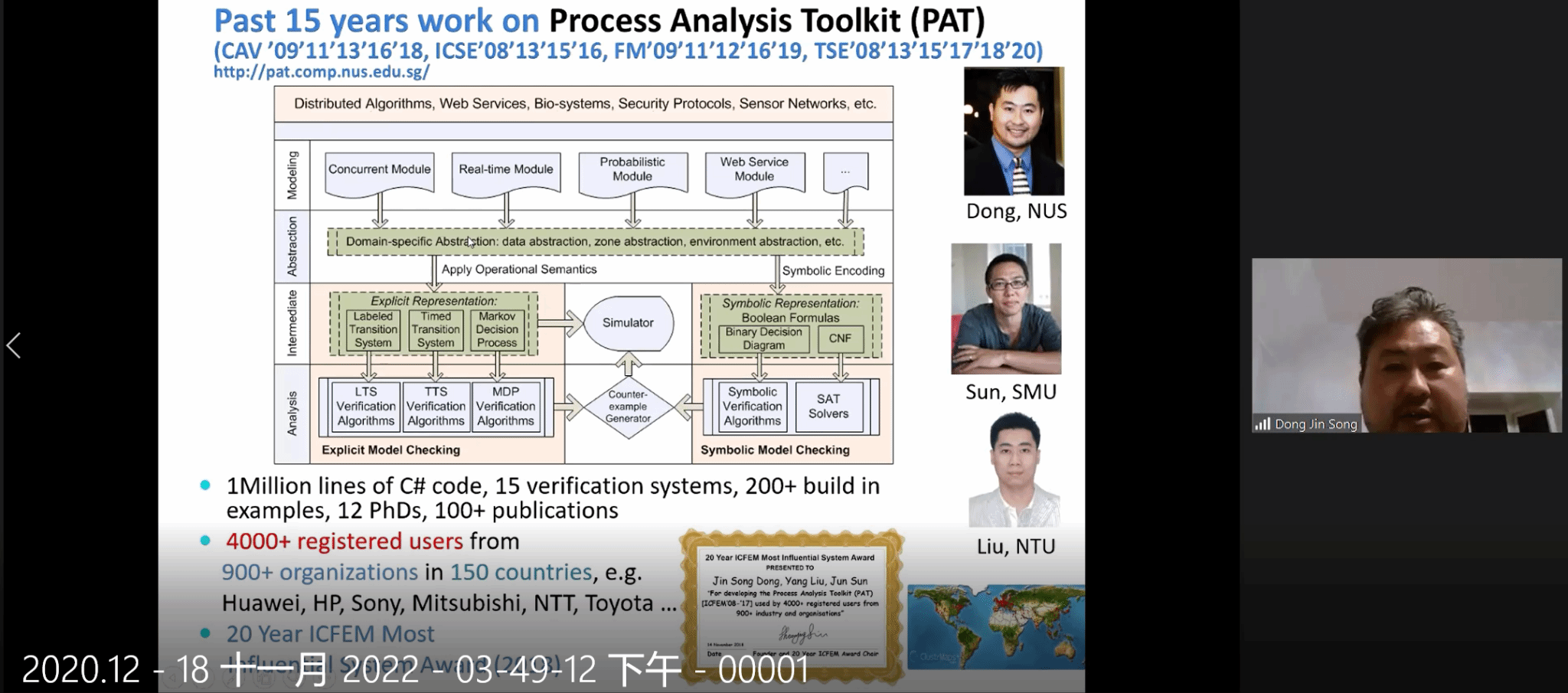 论坛第二部分由新加坡国立大学,澳大利亚工程师学会会士Dong Jinsong教授以《Trusted Decision Making and Dependable Intelligence》为主题进行了主旨报告,此次报告,Dong Jinsong教授重点介绍了通过模型检测,特别是过程分析工具包(PAT),将形式推理应用于事件规划,目标推理,预测,策略分析和决策制定。PAT将状态,事件,时间和以概率为基础的语言表达与高度优化的模型检测算法相结合,目前PAT支持多个应用领域的各种建模语言,吸引了来自数百个组织的数千名注册用户。