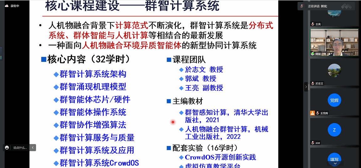郭斌副院长、王亮副教授分别做了《智能时代物联网工程课程体系改革之<群智计算系统>课程建设探讨》以及《<群智计算系统>课程建设初探》的报告。郭斌教授从智能时代物联网工程专业的课程体系改革视角全面而详细地阐述了《群智计算系统》课程的建设思路、建设内涵、日本av无码成果如何反哺课程建设等方面内容。王亮副教授围绕课程建设的背景以及课程大纲、建设基础等进行了汇报。