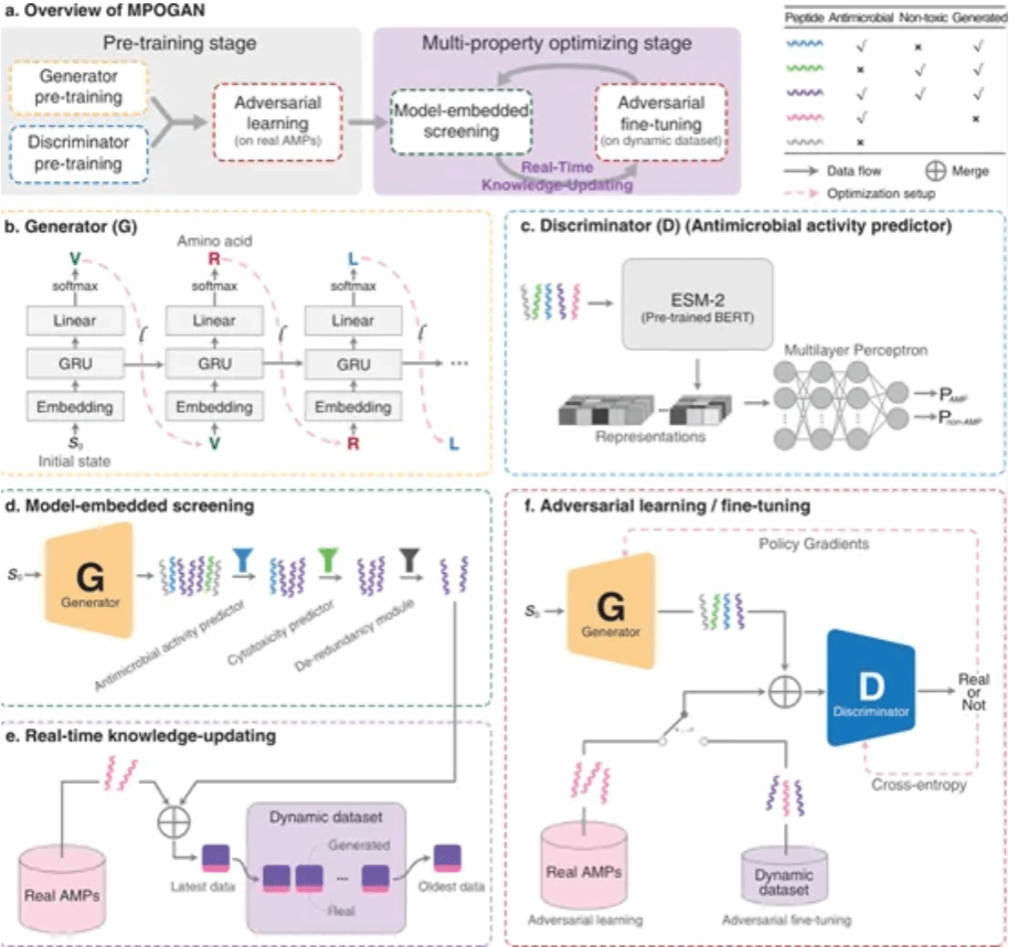 抗菌肽(AMP)是一类具有抗菌活性的小分子多肽药物,由于其广谱抗菌特性且不易诱导细菌产生耐药性,AMP成为应对全球细菌耐药性问题的重要研究方向。然而,AMP从头设计领域目前仍面临诸多挑战。实验室合成AMP的过程耗时且成本高昂;且抗菌肽不同属性之间可能存在冲突,使得现有计算方法难以同时优化多种目标特性(如抗菌活性、低毒性和序列多样性等)。为了解决这些挑战,该论文提出了面向抗菌肽多属性同步优化的生成对抗网络(MPOGAN)。通过设计嵌入式和串联式的属性评估器,筛选生成模型生成的高质量肽序列,并提出实时知识更新(RTKU)策略,动态更新训练数据集,从而迭代学习肽序列与多种治疗属性之间的关系,使生成模型逐渐具备生成具有多种优良属抗菌肽的能力。实验结果表明,MPOGAN在生成满足多种目标属性(高抗菌活性、低毒性和序列多样性)的抗菌肽方面优于现有方法。通过与日本av无码